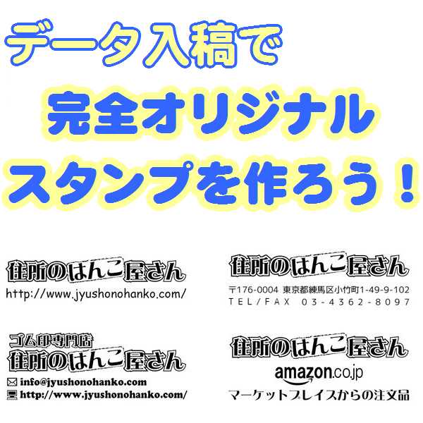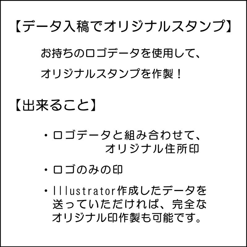 この住所印は、データ入稿を使用して制作いただけます。あなたのオリジナルロゴやデザインがそのまま印影になるので、個性を発揮しながら宣伝効果も抜群!おしゃれな雰囲気が漂うとともに、情報を明確に伝えます。利便性とデザイン性を両立させた一品です。